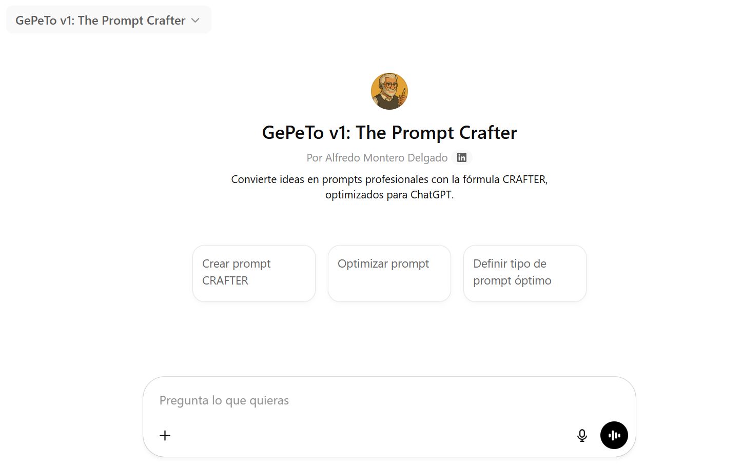 Optimizar uno que ya tengas (refinamiento): Si ya tienes un borrador, pégalo tal cual. GePeTo lo revisará y lo optimizará siguiendo C.R.A.F.T.E.R. (detectando huecos de contexto, estructura o claridad).